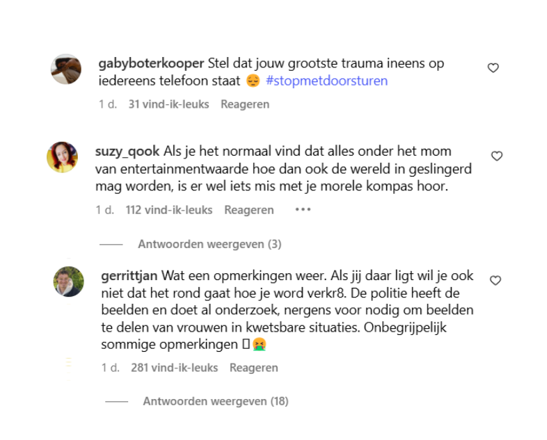 Daarbij maakt iemand het duidelijk dat niemand het leuk zou vinden als er beelden op het internet rondgaan van hoe iemand slachtoffer wordt van een verkrachting. "De politie heeft de beelden en doet al onderzoek, nergens voor nodig om beelden te delen van vrouwen in kwetsbare situaties. Onbegrijpelijk sommige opmerkingen."