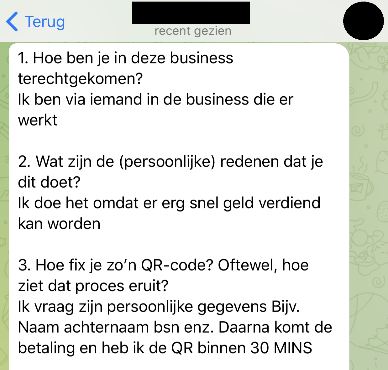 De geïnterviewde is strafbaar en wil daarom volledig anoniem blijven. Om deze anonimiteit te waarborgen, was hij enkel bereid om via Telegram te communiceren. Dit is geen gangbare procedure. Normaal gesproken zijn bij de redactie altijd de volledige namen van geïnterviewden bekend, ook als deze anoniem hun verhaal delen.