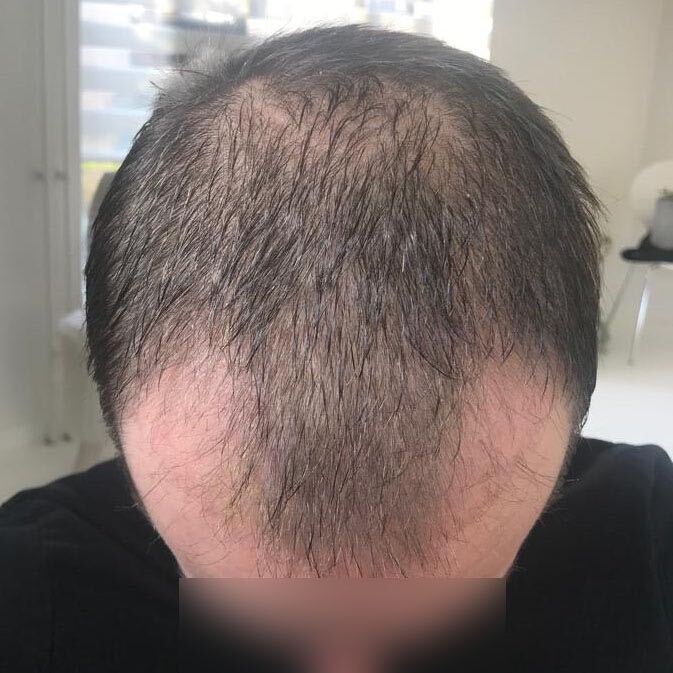 Twee maanden na de behandeling, waarbij het 'nieuwe haar' weer is uitgevallen (Gerben)