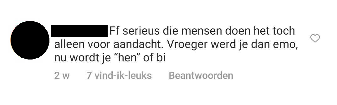 Megan: "Ik denk alleen maar: waarom? Ik snap niet waarom er zoveel haat is naar LHBTIQ+'ers. Het maakt me boos van binnen. Waarom zouden we dit voor aandacht doen? Een van de redenen waarom het zo moeilijk is om uit de kast te komen, is omdat we weten dat we ermee gepest kunnen worden. Waarom zouden we dit dan voor aandacht doen? Ik vind het heel kinderachtig dat iemand dit comment."