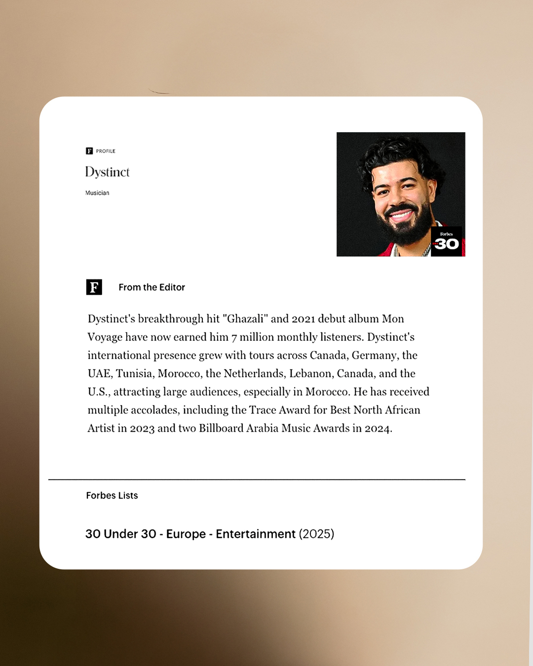 Met twee Billboard Arabia Music Awards, zeven miljoen maandelijkse streams en uitverkochte shows is het niet verrassend dat DYSTINCT in de Forbes-lijst is benoemd. "Dystincts internationale aanwezigheid groeide met tournees door Canada, Duitsland, de VAE, Tunesië, Marokko, Nederland, Libanon, Canada en de VS, waar hij grote publieken aantrok, vooral in Marokko. Hij heeft meerdere onderscheidingen ontvangen, waaronder de Trace Award voor Beste Noord-Afrikaanse Artiest in 2023 en twee Billboard Arabia Music Awards in 2024", schrijft Forbes bij de aankondiging.