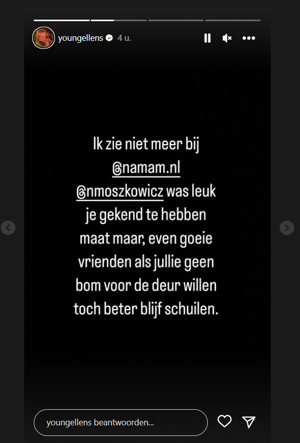 "Ik zit niet meer bij NAMAM", begint Young Ellens zijn Instagrambericht. "Nathan Moszkowics, het was leuk je gekend te hebben maat, maar even goede vrienden als jullie geen bom voor de deur willen." De rapper raadt Moszkowics vervolgens aan om 'toch beter te blijven schuilen'.