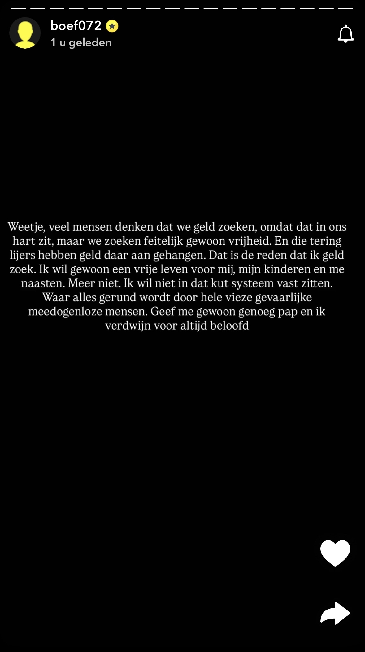Boef schrijft op Snapchat namelijk dat hij geld wil verdienen, omdat hij op zoek is naar vrijheid. En vrijheid heeft volgens hem een prijs. "Dit is de reden dat ik geld zoek. Ik wil gewoon een vrij leven voor mij, mijn kinderen en mijn naasten. Meer niet", zegt Boef. De rapper vervolgt zijn verhaal met dat hij niet vast wil zitten in het systeem."Ik wil niet in dat k*t systeem vastzitten, waar alles gerund wordt door vieze, gevaarlijke en meedogenloze mensen. Geef me gewoon genoeg pap en ik verdwijn voor altijd. Beloofd."