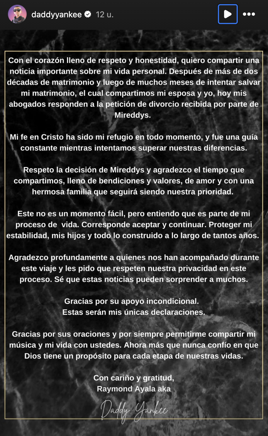 In een verklaring benadrukt Daddy Yankee dat hij het nieuws oprecht naar buiten brengt. “Met respect en eerlijkheid wil ik belangrijk nieuws delen over mijn persoonlijke leven. Na bijna dertig jaar huwelijk en vele maanden waarin we hebben geprobeerd onze relatie te redden, reageren mijn advocaten vandaag op de echtscheidingsaanvraag die Mireddys heeft ingediend.”