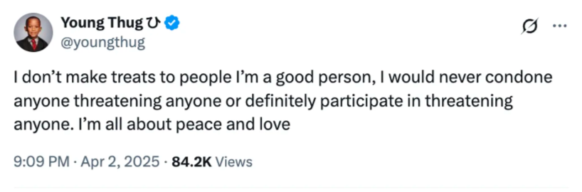 Young Thug reageerde op het de situatie via X. Hij schreef: "Ik bedreig niemand. Ik ben een goed persoon. Ik zou nooit iemand aanmoedigen of deelnemen aan het bedreigen van iemand." En hij voegde eraan toe: "Ik ben voor vrede en liefde."