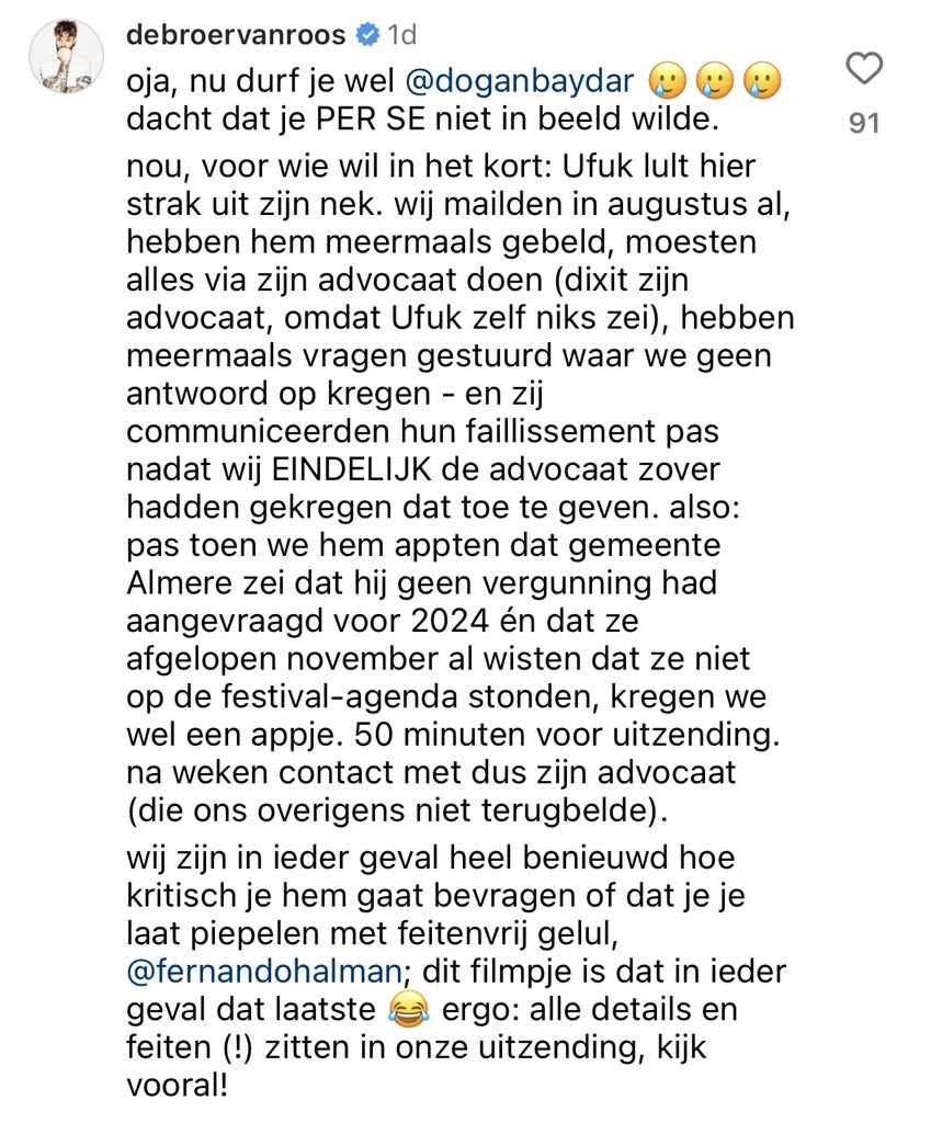 Onlangs lanceerde Tim Hofman een nieuwe BOOS-aflevering. Daarin was te zien dat enkele gedupeerden het programma in hadden geschakeld om achter hun geld aan te gaan nadat ze tickets kochten voor het afgelaste OH MY! Festival in 2023. Tim Hofman vroeg OH MY! CEO Ufuk Baydar meermaals om tekst en uitleg, maar volgens Hofman weigerde Baydar dat. Nu vertelt Baydar zijn kant van het verhaal bij Real Talk van Fernando Halman.