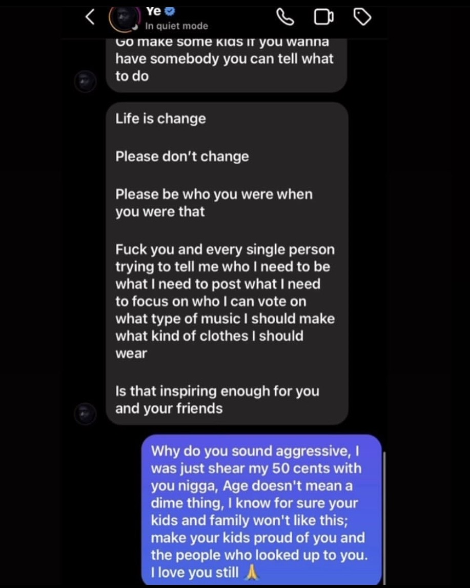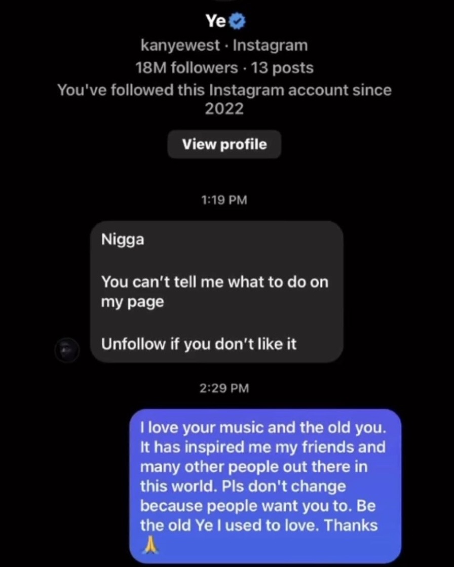 In een reeks screenshots laat de fan zien dat Kanye West zijn feedback niet waardeert. "Je kunt me niet vertellen wat ik moet doen op mijn pagina. Ontvolg me als je het niet leuk vindt", schrijft de rapper. Hoewel Ye in eerste instantie vrij rustig overkomt, slaat de sfeer snel om als de fan vraagt om 'de oude Kanye'. "Ik hou van jouw muziek en de oude jij. Het heeft mij, mijn vrienden en veel andere mensen enorm geïnspireerd. Asjeblieft, verander niet. Wees de oude Ye waar ik van hou. Dank je wel", aldus de fan.