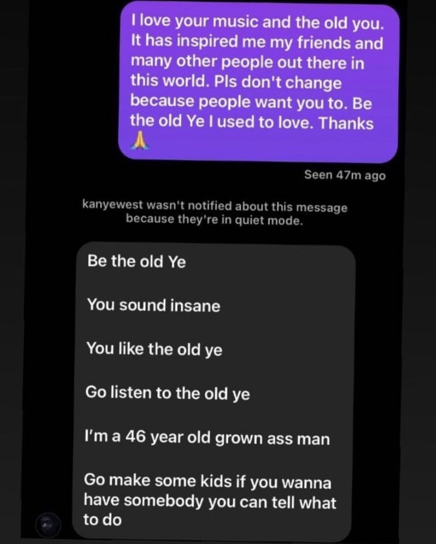 Kanye West vindt het verzoek van de fan maar vreemd. "Je klinkt gestoord", schrijft hij terug. "Als je van de oude Ye houdt, luister dan naar de oude Ye. Maar op dit moment ben ik een 46-jarige volwassen man." De rapper maakt vervolgens duidelijk dat hij zich niet laat vertellen hoe hij zich moet gedragen. "Ga kinderen maken als je graag mensen wil hebben die je kunt vertellen wat ze moeten doen."