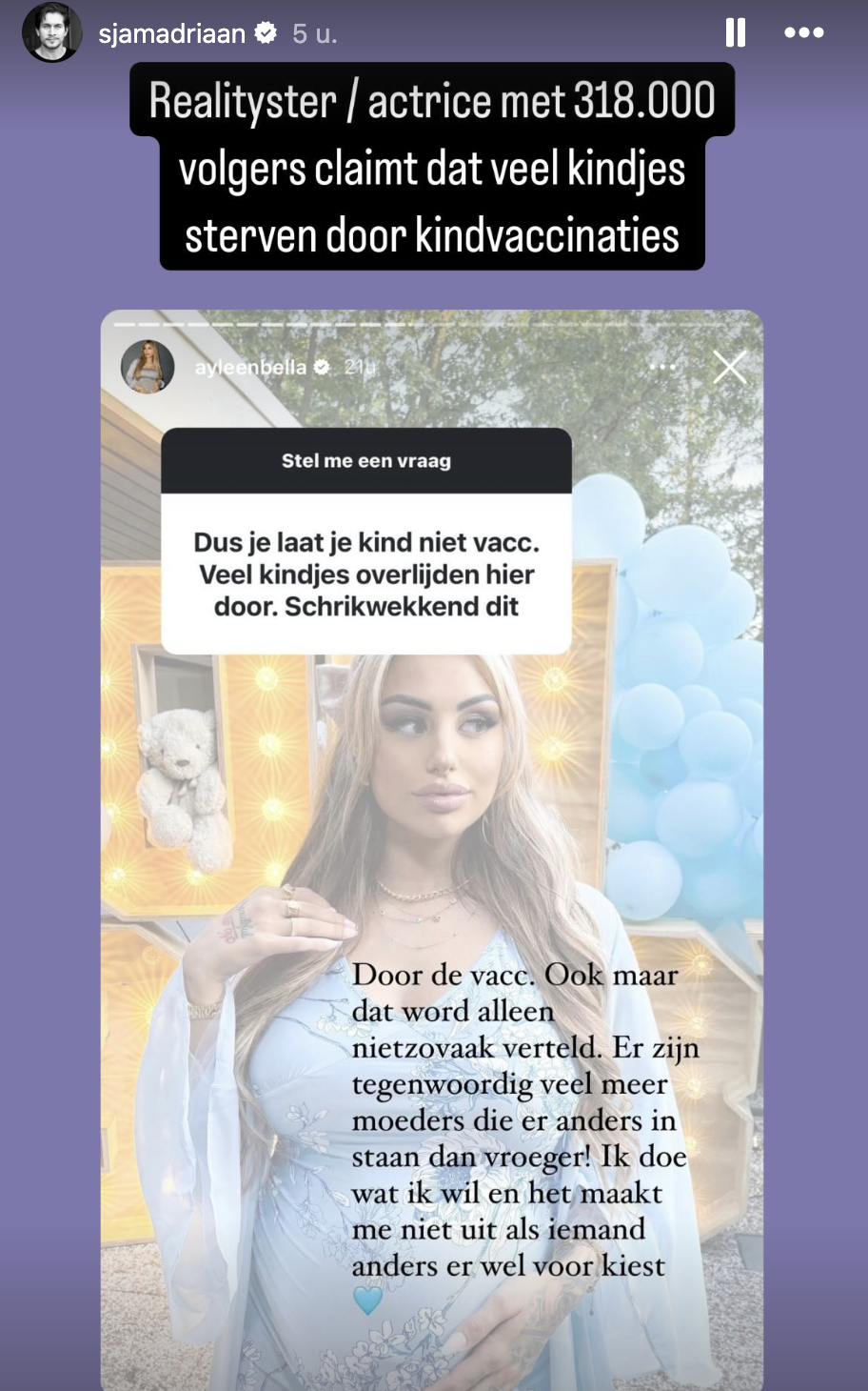 Ook journalist Adriaan ter Braack, op socials ook wel bekend onder de naam Sjamadriaan, reageerde vol verbazing op de onthulling van Ayleen Bella. De journl, die erom bekendstaat andere mensen te wijzen op feitelijke onjuistheden op wetenschappelijk vlak, had geen goed woord over het besluit van Ayleen Bella. Vooral niet omdat ze beweert dat kinderen overlijden van de vaccinaties. Volgens Adriaan ter Braack overlijden kinderen wanneer ze juist niet gevaccineerd zijn. Ook heeft de wetenschapsjournalist er moeite mee dat Ex On The Beach-deelneemster ruim 300.000 volgers kan beïnvloeden. Zo zei hij in een gedeeld DM-gesprek tegen Ayleen Bella: “Je verkondigt schadelijke onzin.”