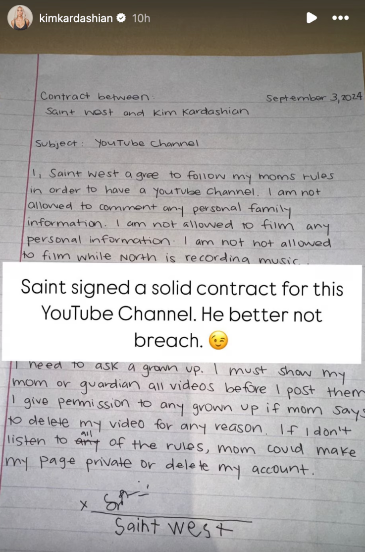 Bij de lancering van Saints kanaal deelde Kardashian op sociale media een overeenkomst die zij voor haar zoon had opgesteld. In deze overeenkomst stond onder meer: "Ik moet alle video's aan mijn moeder of voogd laten zien voordat ik ze plaats. Ik geef toestemming aan elke volwassene om mijn video te verwijderen als mama dat zegt, om welke reden dan ook". De regels van de overeenkomst waren streng; als Saint zich niet aan de regels zou houden, had Kardashian het recht om het kanaal op privé te zetten of zelfs te verwijderen. Saint mocht ook geen persoonlijke informatie delen of filmen.