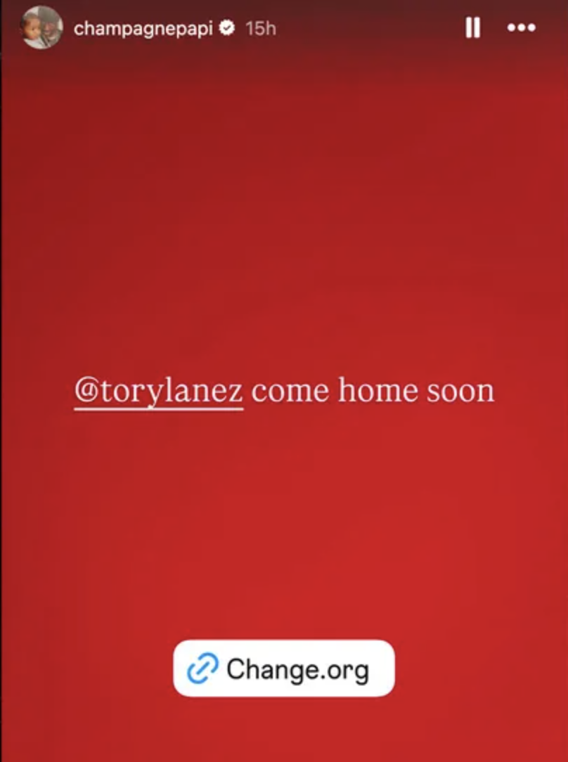 Drake steunt zijn gedetineerde vriend Tory Lanez publiekelijk. De rapper deelde vrijdagavond een petitie waarin wordt opgeroepen tot gratie voor de artiest die momenteel een gevangenisstraf van tien jaar uitzit. Zo schreef Drake op zijn Instagram Story: "Kom snel thuis", met daaronder een link naar de Change.org-petitie.
