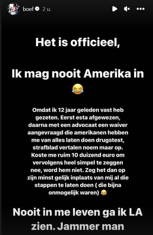 Boef mag naar eigen zeggen de Verenigde Staten niet meer in. In zijn Instagram Stories schrijft hij dat hij een aantal jaar geleden heeft vastgezeten en dat hij daardoor het land niet meer in kan. ''Nooit in mijn leven ga ik LA zien, jammer man'', post de 30-jarige rapper.