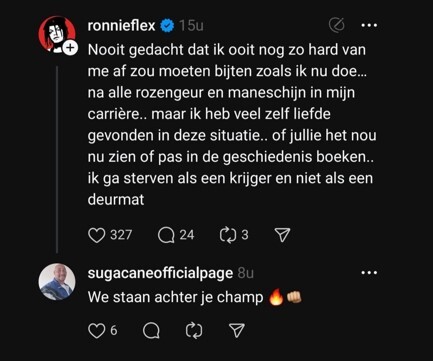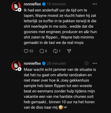 Een dag eerder schreef Ronnie Flex op Threads ook al over de disstrack aan het adres van Jiggy Djé, Sticks en Hef. "Nooit gedacht dat ik ooit nog zo hard van me af zou moeten bijten als dat ik nu doe." De rapper kende in zijn carrière veel successen. Zijn struggles met Top Notch zorgden er echter voor dat hij zichzelf opnieuw moest ontdekken. "Ik heb veel liefde voor mezelf gevonden in deze situatie. Of jullie het nu zien of pas in de geschiedenisboeken: ik zal sterven als een krijger en niet als een deurmat."
