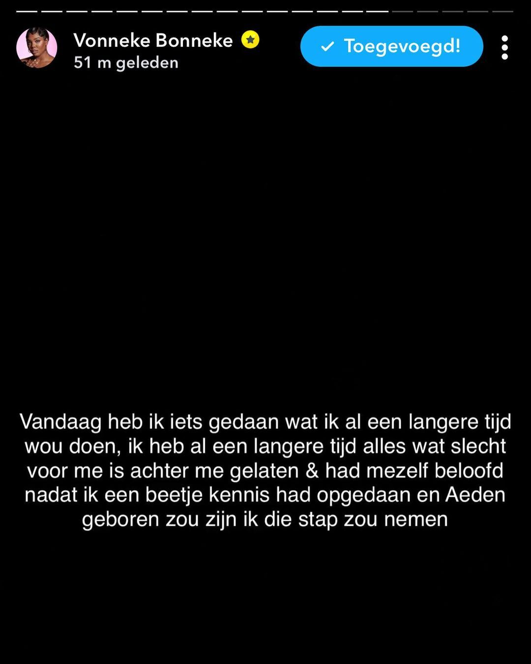 "Vandaag heb ik iets gedaan wat ik al langere tijd wilde doen", schreef Vonneke op haar story. "Ik heb al langere tijd alles wat slecht voor me is achter me gelaten." Ze vertelt dat ze zichzelf had beloofd na de geboorte van haar zoontje Aeden de stap zou zetten om zich te bekeren.