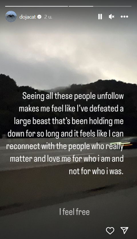 Doja Cat heeft een controversiële post op haar Instagram-story geplaatst, wat voor veel verwarring zorgt onder haar fans. De zangeres zegt namelijk blij te zijn dat mensen haar ontvolgen en voelt zich daarom juist "vrij". Het gaat in totaal om zo'n 500 duizend volgers.