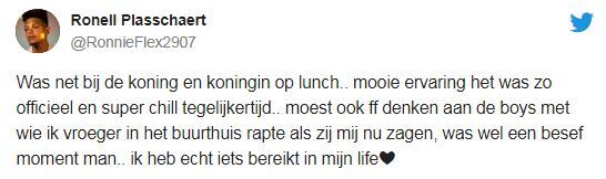 Ronnie laat op Twitter weten de lunchafspraak een mooie ervaring te vinden. Ook zegt hij dat Máxima naar zijn dochtertje Nori vroeg. "Wanneer Nori ouder is, imma be like: ja schat, de koningin kent jou!"