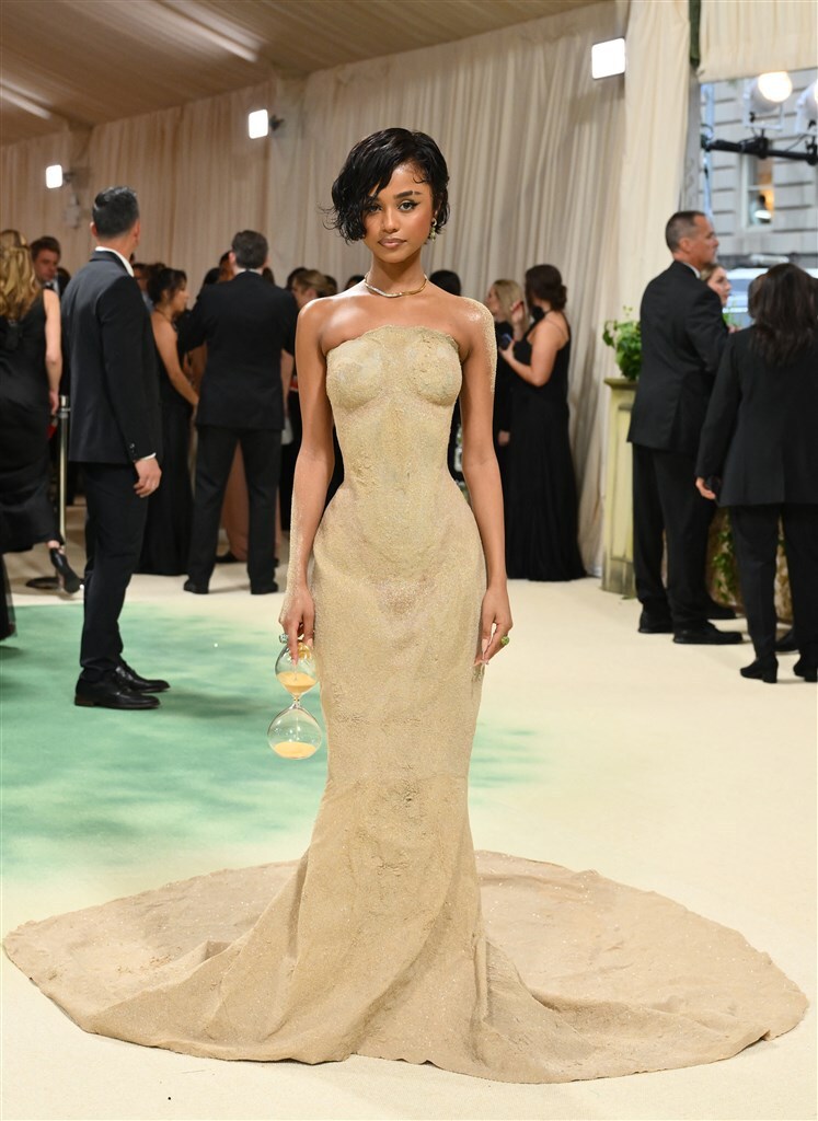 Hoogstwaarschijnlijk ken je Tyla van haar hitsingle Water. Voor haar outfit verruilde ze water echter voor zand, want de Met Gala-debutant imponeerde met een jurk die gemaakt is van zand. De ontwerpers van Balmain gebruikten voor de dress drie verschillende kleuren zand en microkristallen stud om ervoor te zorgen dat Tyla bij elke beweging zou schitteren. Als kers op de taart droeg ze ook nog een zandloper met zich mee, wat gezien kan worden als een knipoog naar het thema 'The Garden of Time'.