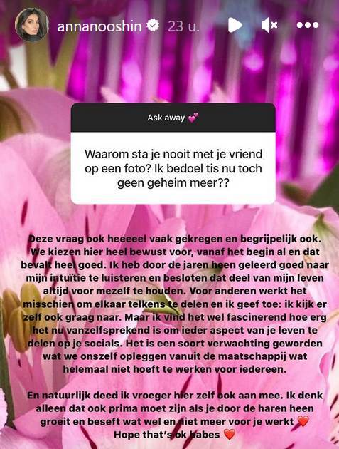 De influencer deed op haar Instagram story's een vragenrondje. Als een volger van Anna Nooshin vraagt: "Waarom sta je nooit met je vriend op een foto? Ik bedoel het is nu toch geen geheim meer?", geeft ze uitgebreid antwoord. "Deze vraag (heb ik) ook heel vaak gekregen en (dat is) begrijpelijk ook. We kiezen hier heel bewust vanaf het begin al voor en dat bevalt heel goed. Ik heb door de jaren heen geleerd goed naar mijn intuïtie te luisteren en (heb) besloten om een deel van mijn leven altijd voor mezelf te houden. Voor anderen werkt het misschien om elkaar telkens te delen en ik geef toe: ik kijk er zelf ook graag naar. Maar ik vind het wel fascinerend hoe vanzelfsprekend het nu is om ieder aspect van je leven te delen op je socials. Het is een soort verwachting geworden vanuit de maatschappij, die we onszelf opleggen. Dat hoeft helemaal niet te werken voor iedereen. Natuurlijk deed ik hier vroeger ook zelf aan mee. Ik denk alleen dat het ook prima moet kunnen dat je door de jaren heen groeit en beseft wat wel en niet meer voor je werkt. Hope that's ok babes."