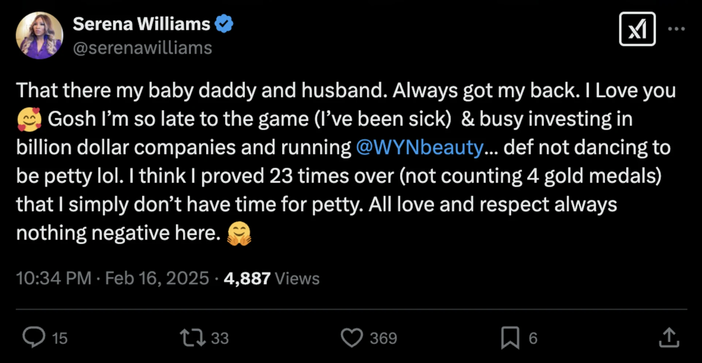 Volgens Serena Williams is het onzin dat ze met Kendrick Lamar op het podium stond omdat ze wrok koestert jegens Drake. Zo spreken haar sportprestaties naar eigen zeggen voor zich. "Ik denk dat ik 23 keer, en dan tel ik de vier Olympische gouden medailles niet eens mee, heb bewezen dat ik geen tijd heb voor wrok. Alleen maar liefde en respect, niks negatiefs hier", aldus de 43-jarige Williams op X. Ook vertelde de legendarische tennisster het op dit moment veel te druk te hebben in haar leven om rancuneus te zijn. Zo zei ze: "Ik ben veel te druk met investeren in miljardenbedrijven en het runnen van WYNbeauty. Ik was zeker niet aan het dansen om 'petty' te zijn."