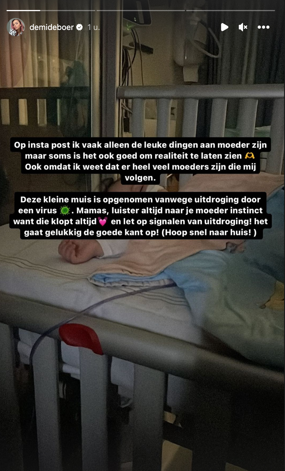 In haar Instagram Stories laat Demi weten niet alleen de leuke dingen aan moeder zijn te willen laten zien. "Soms is het ook goed om de realiteit te laten zien", schrijft ze over een foto van Rémi in een ziekenhuisbedje. "Deze kleine muis is opgenomen vanwege uitdroging door een virus. Luister altijd naar je moederinstinct want dat klopt altijd. En let op signalen van uitdroging." Demi laat echter ook weten dat het inmiddels beter gaat met Rémi. "Het gaat gelukkig de goede kant op."