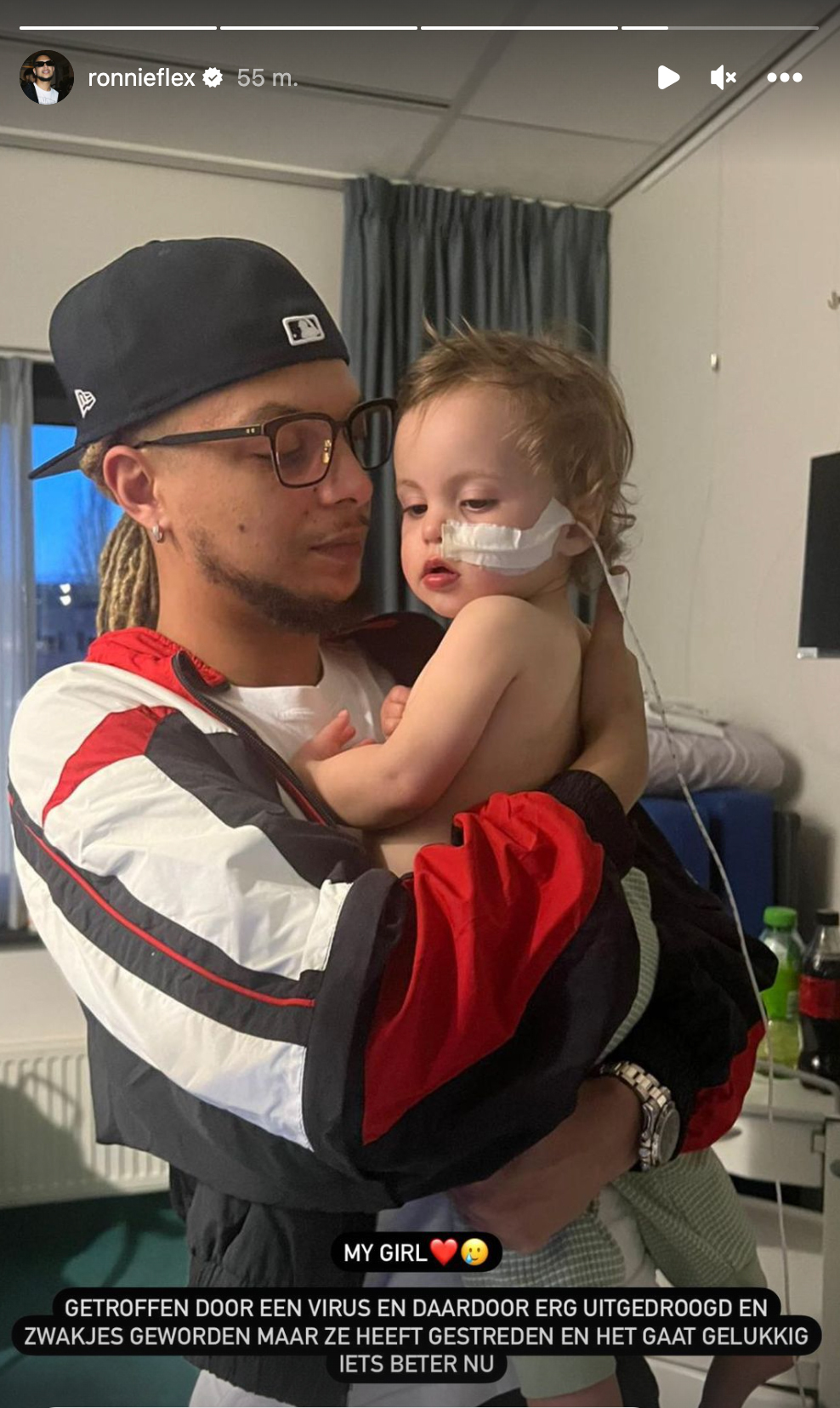 Ook Ronnie deelt foto's van Rémi in het ziekenhuis in zijn Instagram Stories. "My girl", schrijft hij. "Getroffen door een virus en daardoor erg uitgedroogd en zwakjes geworden, maar ze heeft gestreden en het gaat gelukkig iets beter nu."