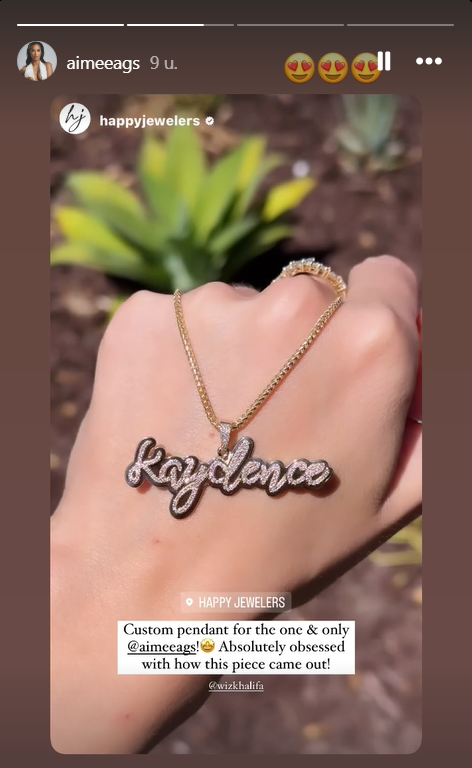 Via haar Instagram Story doet Aimee nog een andere onthulling, namelijk de naam van hun dochtertje. Zo repostte het model een foto van een juwelier waarop een op maat gemaakte ketting te zien is met de naam 'Kaydence.' Dit is het eerste kindje dat het koppel samen heeft gekregen. Wiz Khalifa kreeg eerder in 2013 al een zoon, genaamd Sebastian Taylor Thomaz, samen met zijn ex-partner Amber Rose.