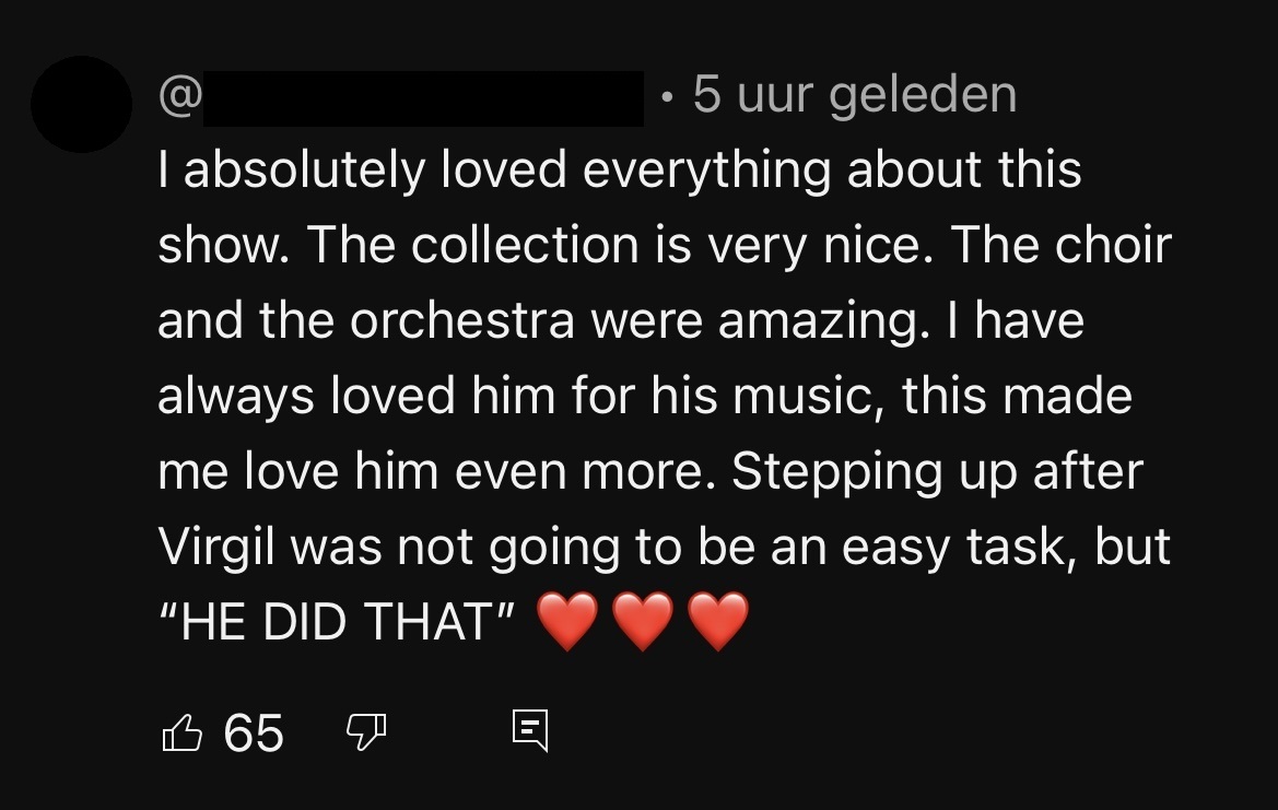 Fans spreken lovend over de show. Zo reageert een fan op YouTube: "Echt alles aan deze show was geweldig. De collectie is heel erg mooi en het gospelkoor was echt geweldig. Ik keek altijd naar hem op vanwege zijn muziek en hierdoor word mijn admiratie voor hem alleen nog maar sterker. Virgil vervangen was geen makkelijke taak, maar hij heeft het gedaan!" Een andere fan zegt: "In deze show schemert de cultuur echt door het merk en andersom. Naar mijn mening is Pharrell de enige persoon die zoiets krachtigs kan neerzetten in de fashion industrie."