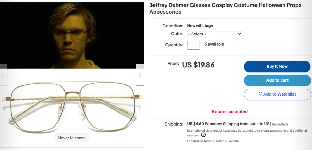 Volgens TMZ werden er talloze Dahmer-verkleeditems aangeboden op eBay. Denk aan brillen, pruiken en overhemden die acteur Evan Peters in de serie droeg. Die items worden door de website nu dus allemaal verwijderd. In het beleid staat dat er geen ruimte is voor "items die nauw verband houden met of ten goede komen aan gewelddadige misdadigers, hun daden of plaatsen delict van de afgelopen 100 jaar".
