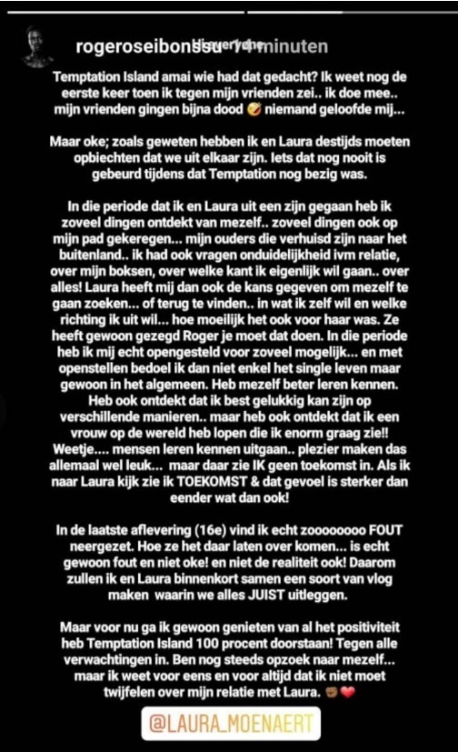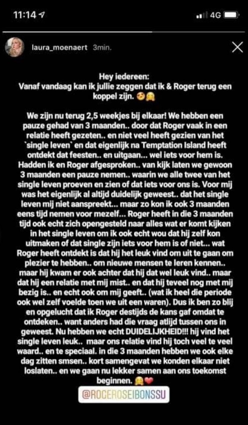 Laura en Roger zijn misschien wel het populairste koppel van dit seizoen. Het stelletje gaf een tijdje geleden aan dat ze niet meer samen zijn. Blijkbaar is dat veranderd, want de tortelduifjes zijn weer bij elkaar! Dat maakte ze bekend via Instagram. Roger vertelde ook dat er een verkeerd beeld wordt neergezet in aflevering zestien, dit blijkt niet de realiteit te zijn.