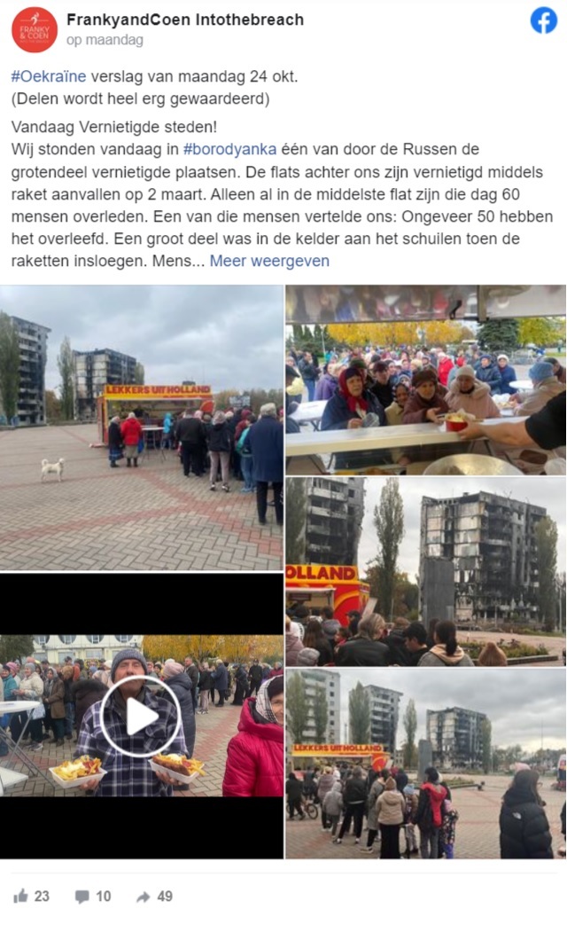 Franky van Hintum en Coen van Oosten, twee frietenbakkers uit Brabant, reizen met hun frietkraam door getroffen gebieden in Oekraïne om gratis friet en snacks uit te delen aan mensen die geraakt zijn door de oorlog. Het tweetal staat met hun frituurkar letterlijk tussen gebouwen die verwoest zijn. Franky en Coen en vertellen in gesprek met AD over hun ervaringen.