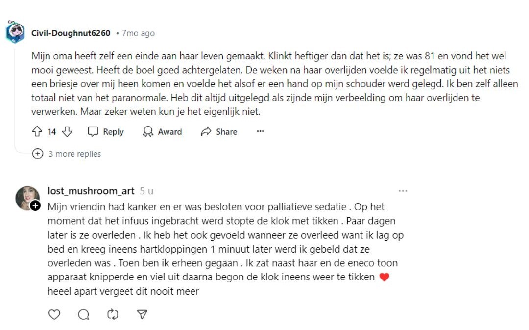 In tegenstelling tot deze toch enigszins enge ervaringen zijn er ook mensen met een fijnere ervaring. Zo delen mensen niet alleen op Threads, maar ook Reddit wat zij hebben meegemaakt omtrent de dood van iemand zij lief hadden.