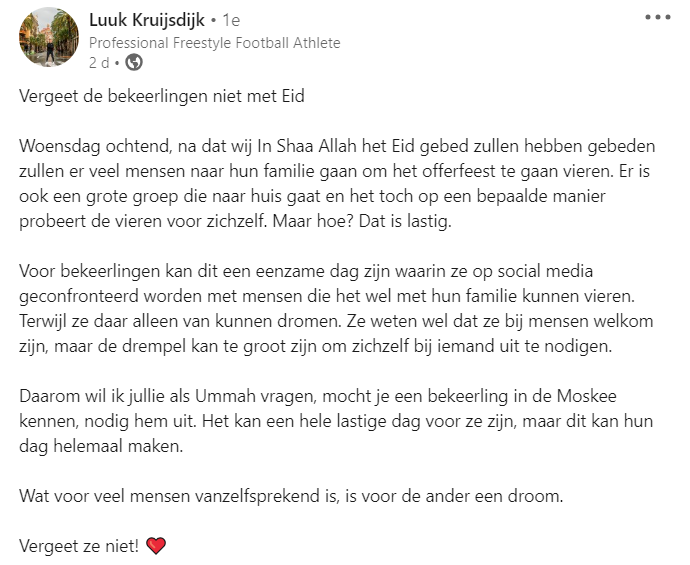 Luuk Kruijsdijk is freestyle voetballer en heeft zich anderhalf jaar geleden bekeerd tot de Islam. Vandaag is het Offerfeest en hij weet als geen ander hoe lastig het kan zijn om dit als beginnend bekeerling te vieren, zonder een familie om het feest mee te vieren. Inmiddels heeft Luuk de mensen gevonden met wie hij deze dag kan vieren. Nu roept hij broeders en zusters op om de bekeerlingen niet te vergeten, zodat zij het Offerfeest niet alleen hoeven te vieren.