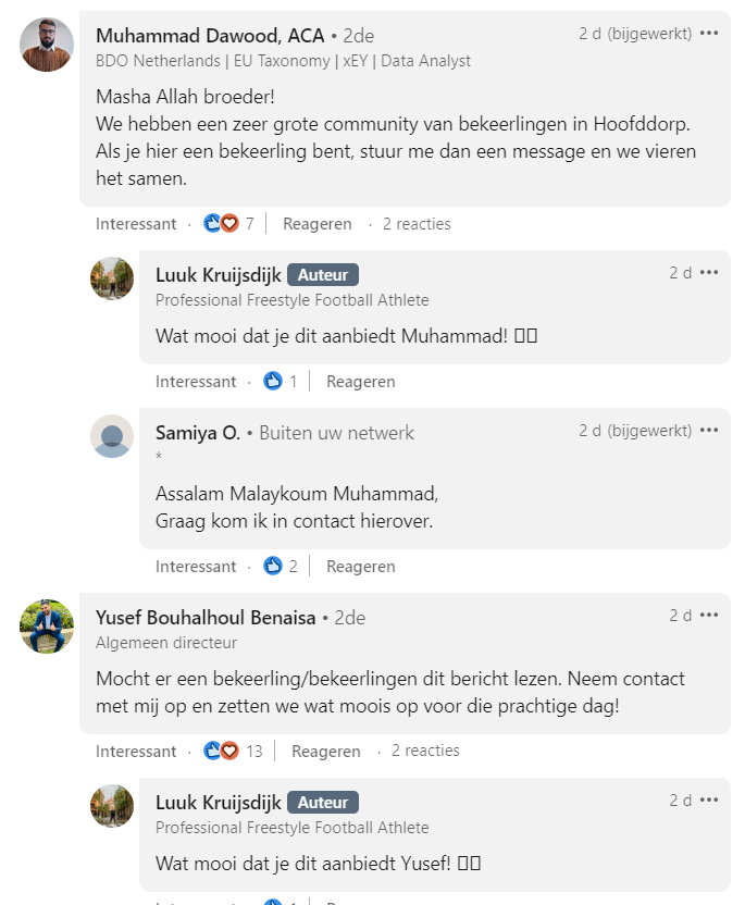 De eerste maanden als bekeerling kunnen lastig zijn, weet Luuk. "Toen ik net bekeerd was, kon ik de Ramadan en andere feestdagen niet samen met mijn familie vieren. Gelukkig heb ik nu fantastische mensen om mij heen en word ik bij vrienden thuis uitgenodigd om feestdagen samen te vieren." Luuk heeft dus ervaren hoe je als bekeerling toch samen kan zijn met vrienden of kennissen als je familie deze feesten niet viert. Dat is dan ook de aanleiding geweest voor zijn oproep via LinkedIn. "Het is niet voor mijzelf, maar voor andere bekeerlingen die wellicht niemand hebben om het Offerfeest mee te vieren."