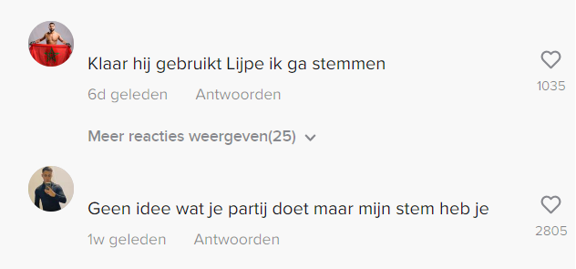 Logisch dus, al gaan sommige TikToks van politici helemaal niet over politiek. "Als ze iets inhoudelijks doen, bijvoorbeeld een filmpje waarin ze hun standpunten uitleggen, wordt dat niet heel goed bekeken", aldus Thomas. Video's met random beelden, flauwe grapjes en herkenbare audiofragmenten gaan daarentegen wel weer hard. "Het gaat dan niet over politiek, maar zo word je wel populair bij de mensen die het bekijken." Of zij het ook eens zijn met de politieke standpunten van de persoon in kwestie, blijft dan maar de vraag...