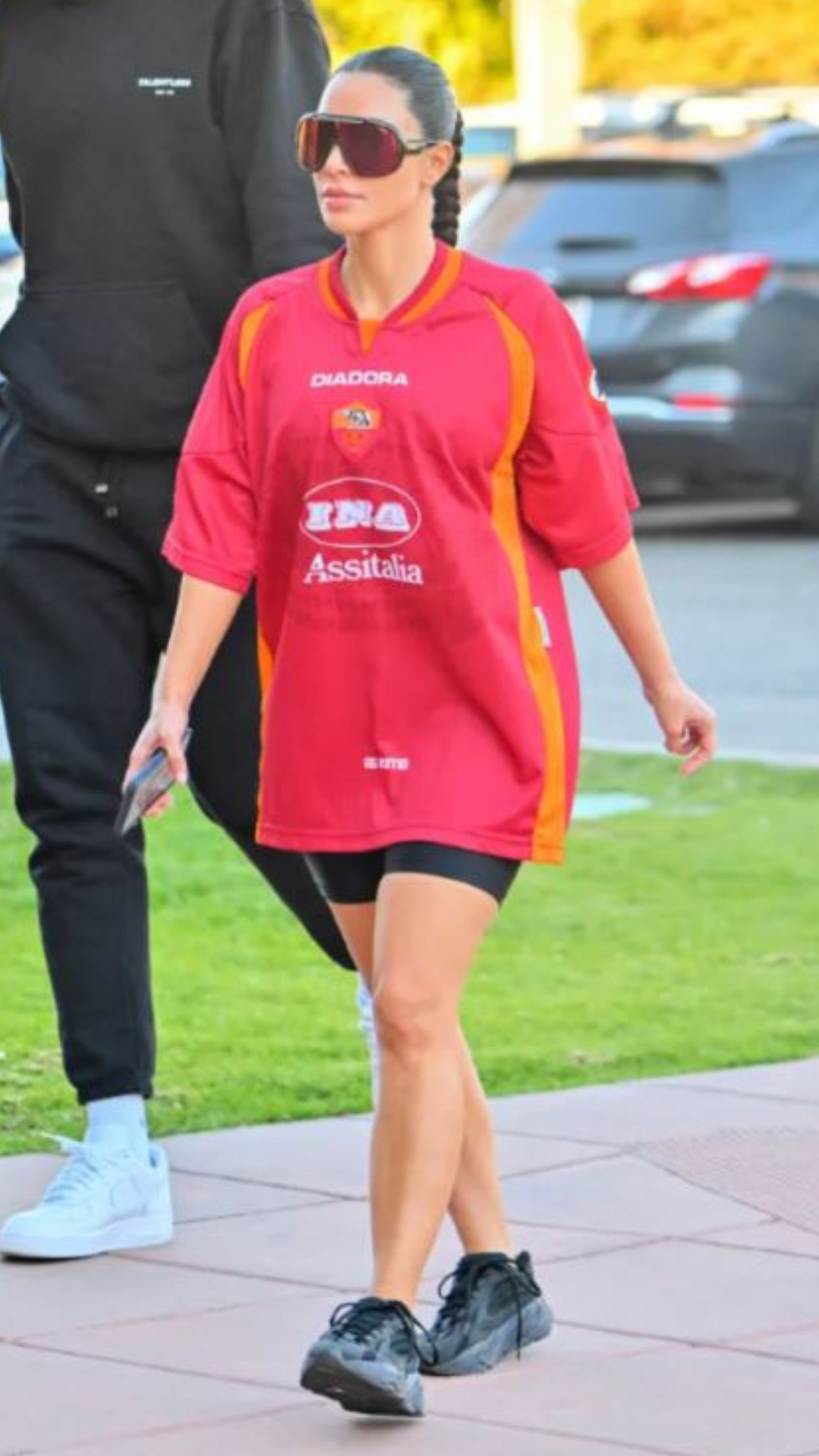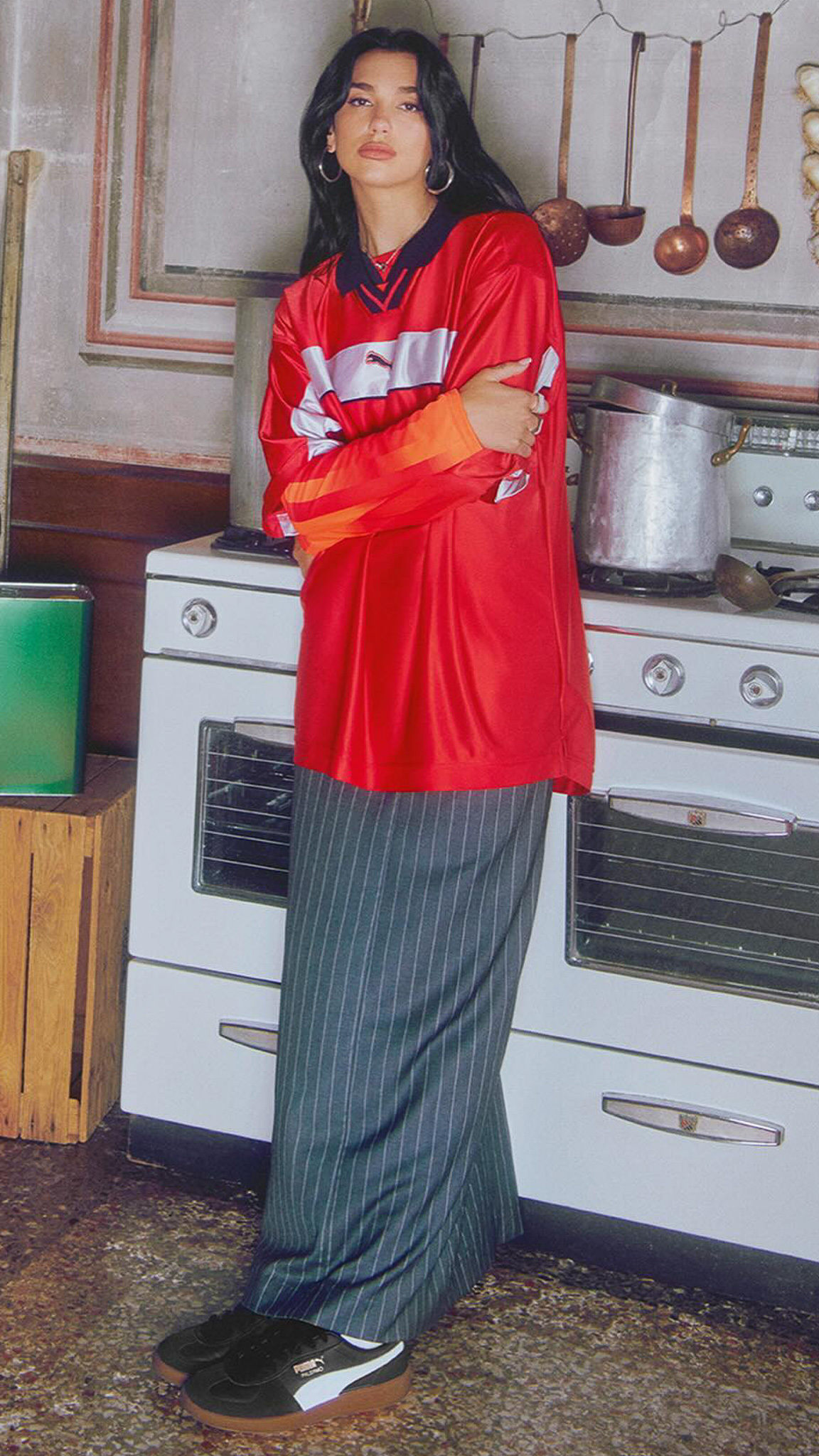 Dua Lipa in door voetbal geïnspireerd shirt en sneakers