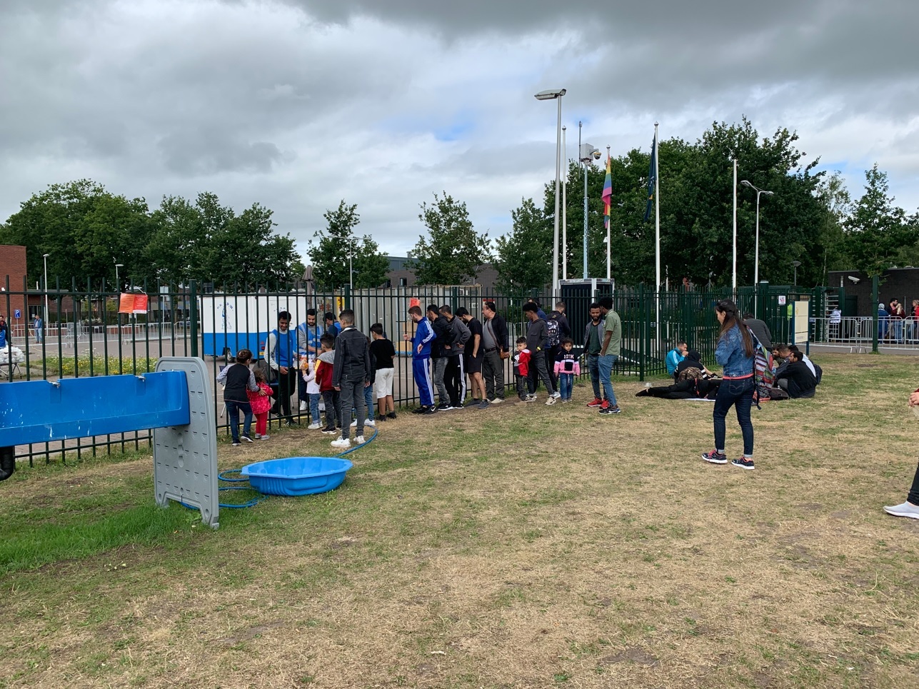 Terwijl ik op het punt stond om mijn gesprek met Khaled af te ronden, zag ik in mijn ooghoeken mensen met blauwe hesjes eten en drinken uitdelen aan de wachtende mensen. "Ga er naartoe", zei ik tegen Khaled, waarna hij me vriendelijk groette en we elkaar het allerbeste wensten.