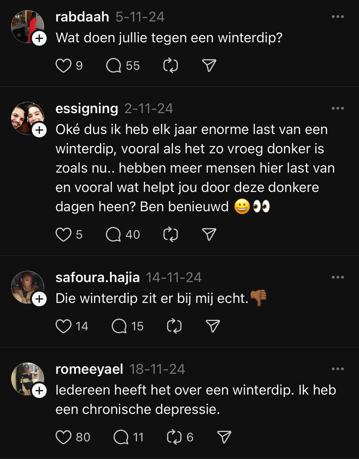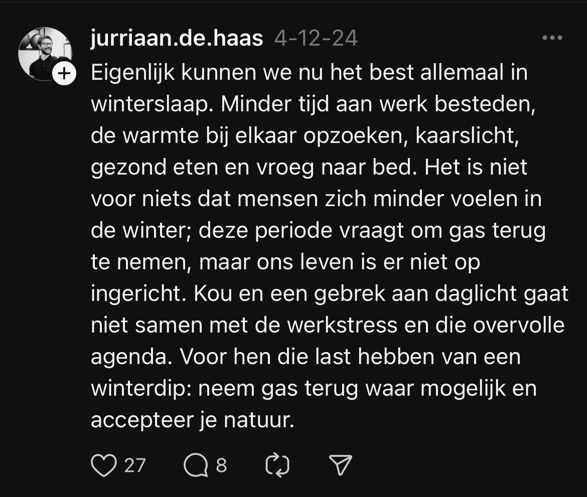In de winter merken veel mensen dat ze minder energie en zin hebben om dingen te ondernemen in vergelijking met de rest van het jaar. Dat komt vaak door het gebrek aan zonlicht, waardoor je minder vitamine D en serotonine aanmaakt. En deze twee stoffen zijn nou net belangrijk voor je energieniveau en humeur. Het is dus niet gek dat je je in de winter eerder moe en minder productief voelt. Sommige mensen die hier last van hebben, laten via Threads weten dat ze zich gedurende de wintermaanden somberder voelen, mede door de kou en de donkere dagen.