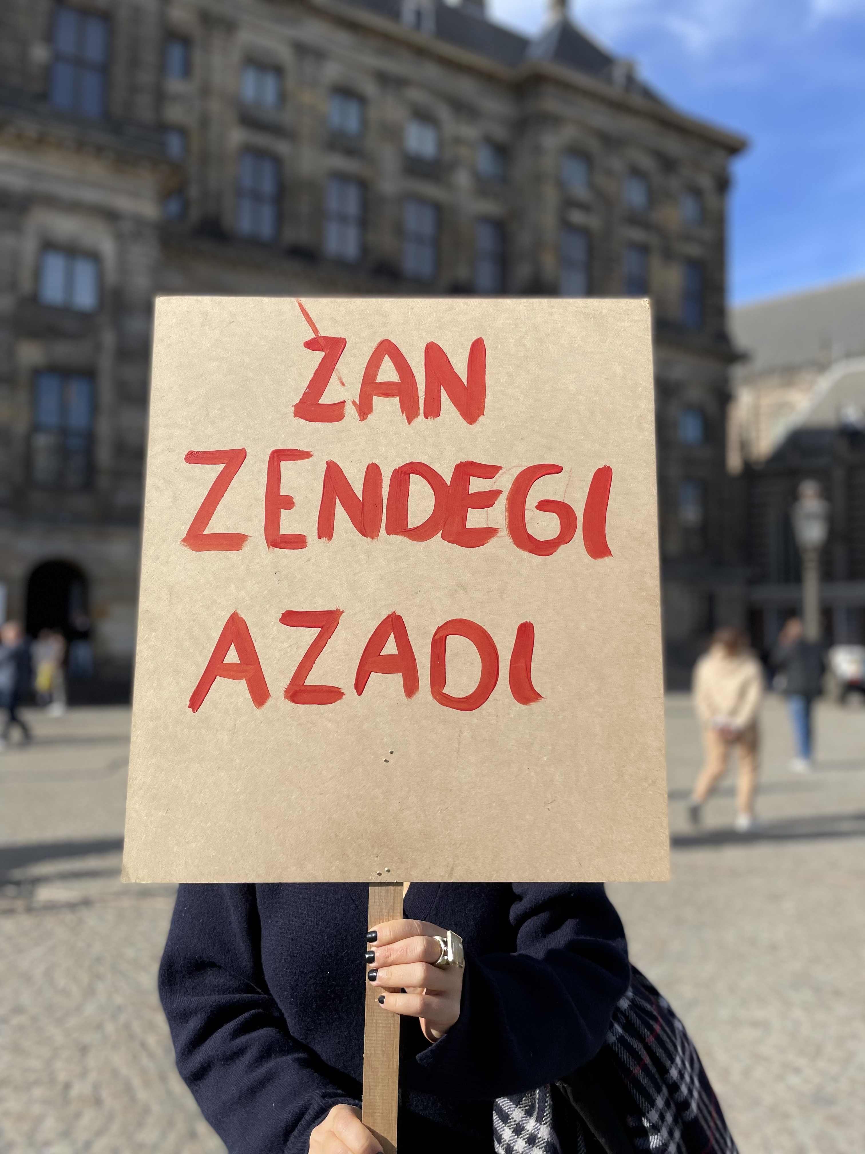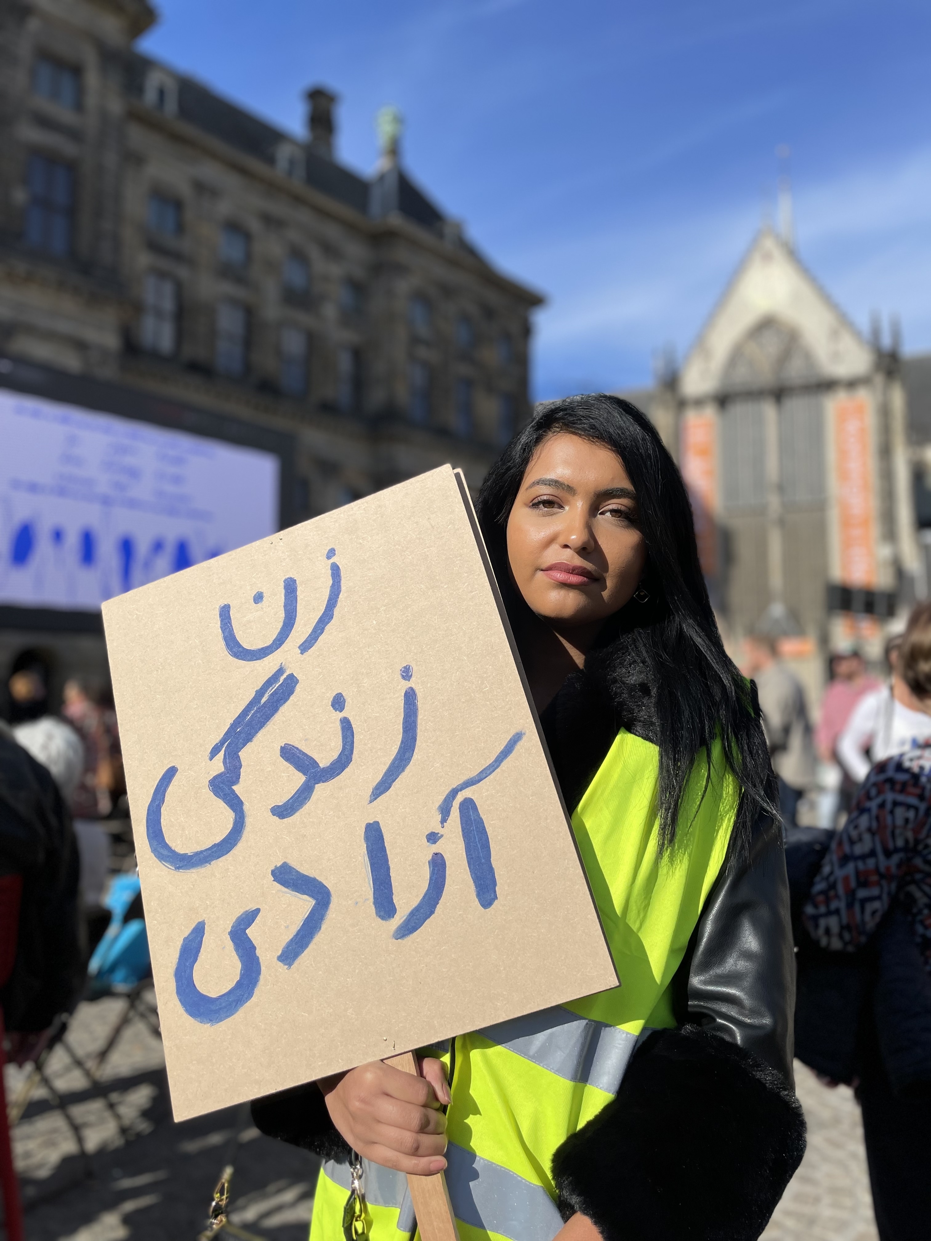 "Ik ben hier om te vechten voor de mensenrechten van de vrouwen in Iran. Mijn moeder heeft me gevraagd om anoniem te blijven, omdat ze bang is dat we in Nederland achtervolgd zullen worden. De angst die wij in Iran hebben gevoeld, hebben we meegenomen naar Nederland. Zo ver reikt het regime. Niet alleen vrouwen in Iran, maar ook vrouwen die vanuit Iran zijn gevlucht naar verschillende delen van de wereld leven met doodsangsten. Toch ben ik hier, omdat ik mijn steentje wil bijdragen. Mijn hart is daar, maar mijn stem is hier. En die stem wil ik gebruiken. In principe ben ik hier vrij, dus ik wil alles doen wat ik kan om de vrouwen daar te ondersteunen."