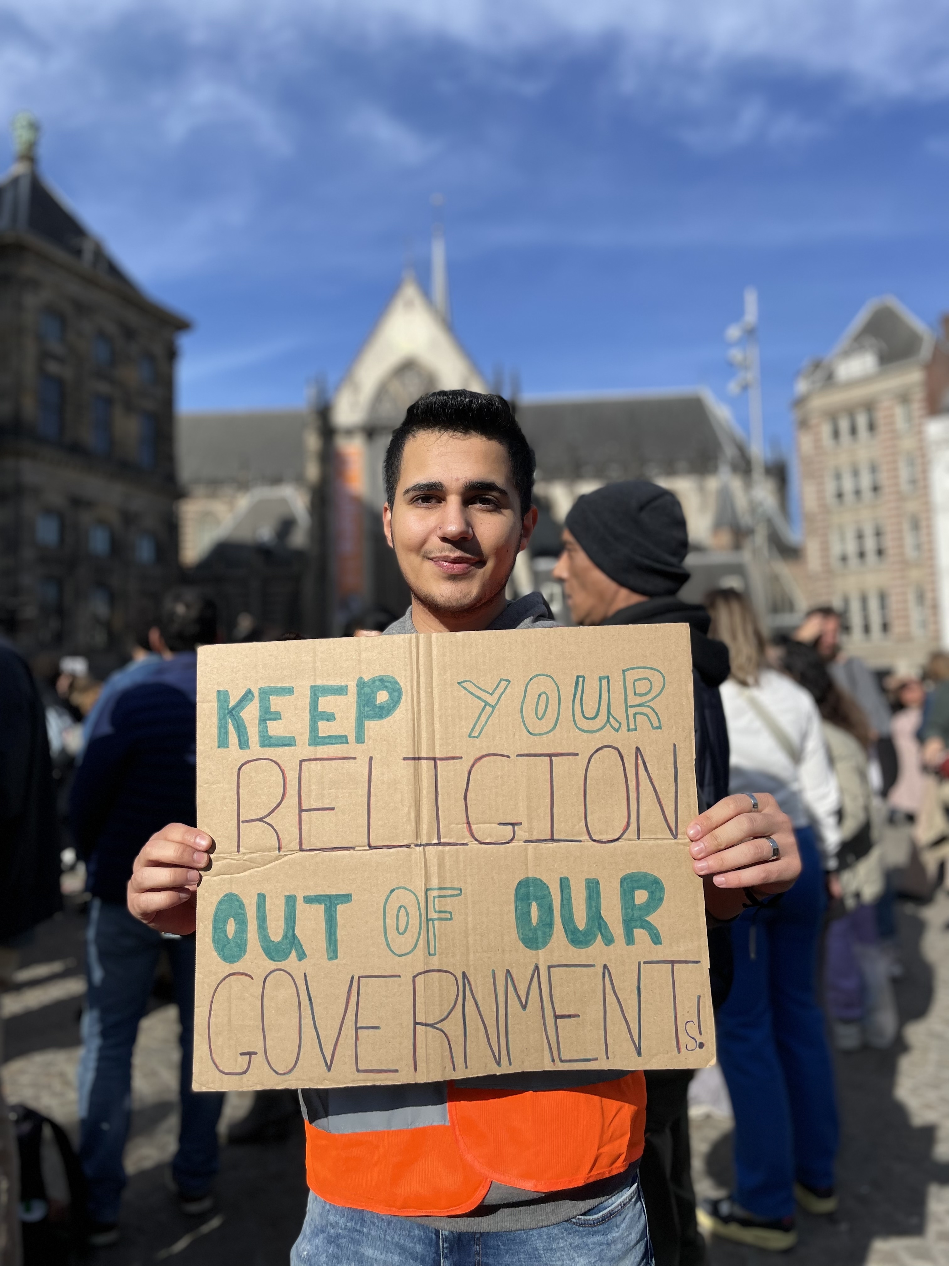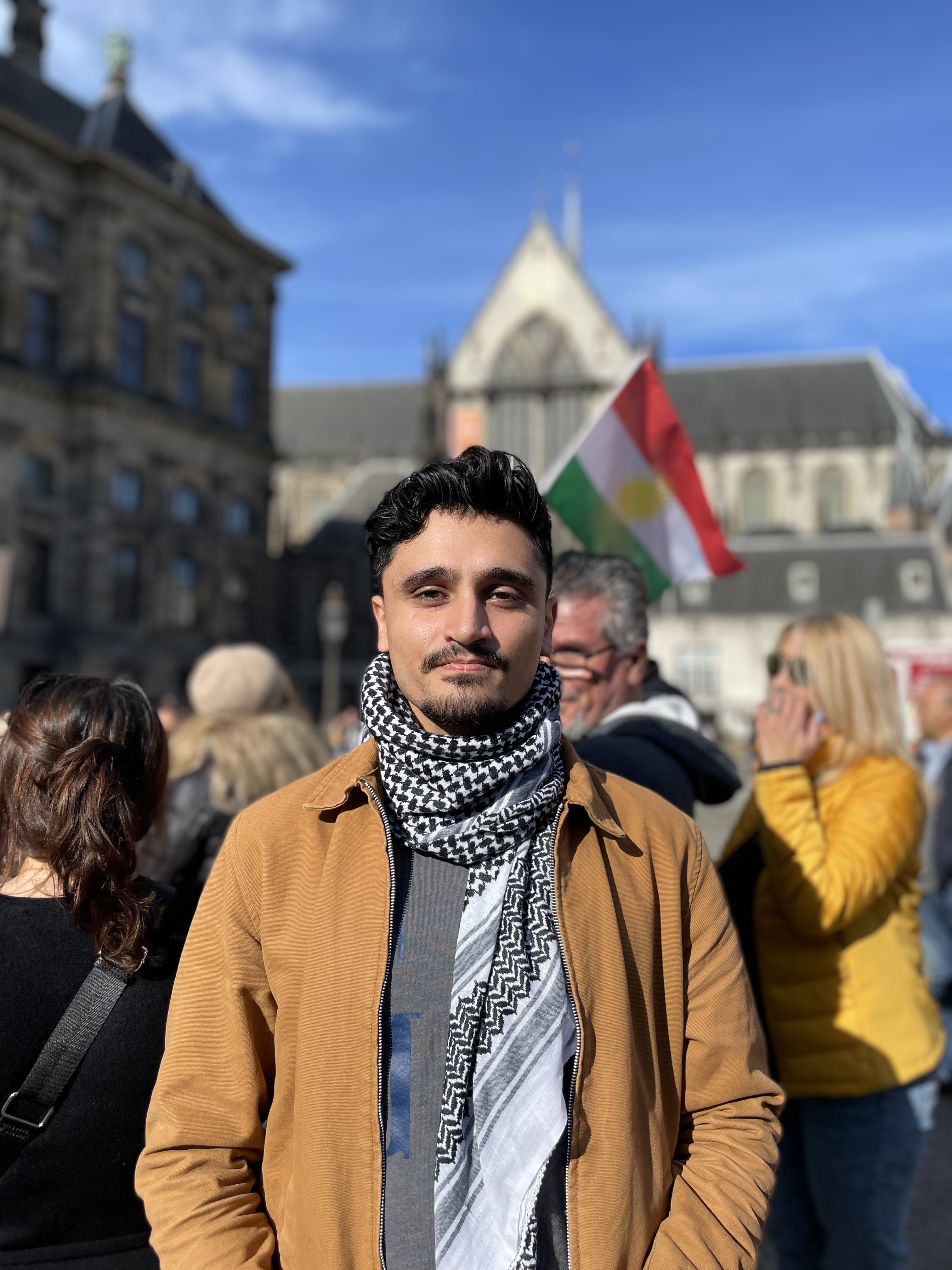 "Ik ben zelf Koerdisch, maar ik sta hier ook voor Iraanse vrouwen en andere mensen die in democratie willen leven. Wat er gebeurt in Iran, is ook een Koerdische kwestie, want ook Koerden worden daar onderdrukt. Er moet een einde komen aan het Iraanse regime dat mensen onderdrukt op basis van hun geloof, gender of etniciteit."