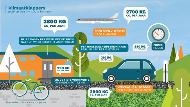 Het woon-werkverkeer zorgt voor een enorme CO2-uitstoot. Al helemaal als je met de auto gaat. Is het niet per se nodig? Ga dan met de trein, fiets of check of je bijvoorbeeld een dagje thuis kan werken!
