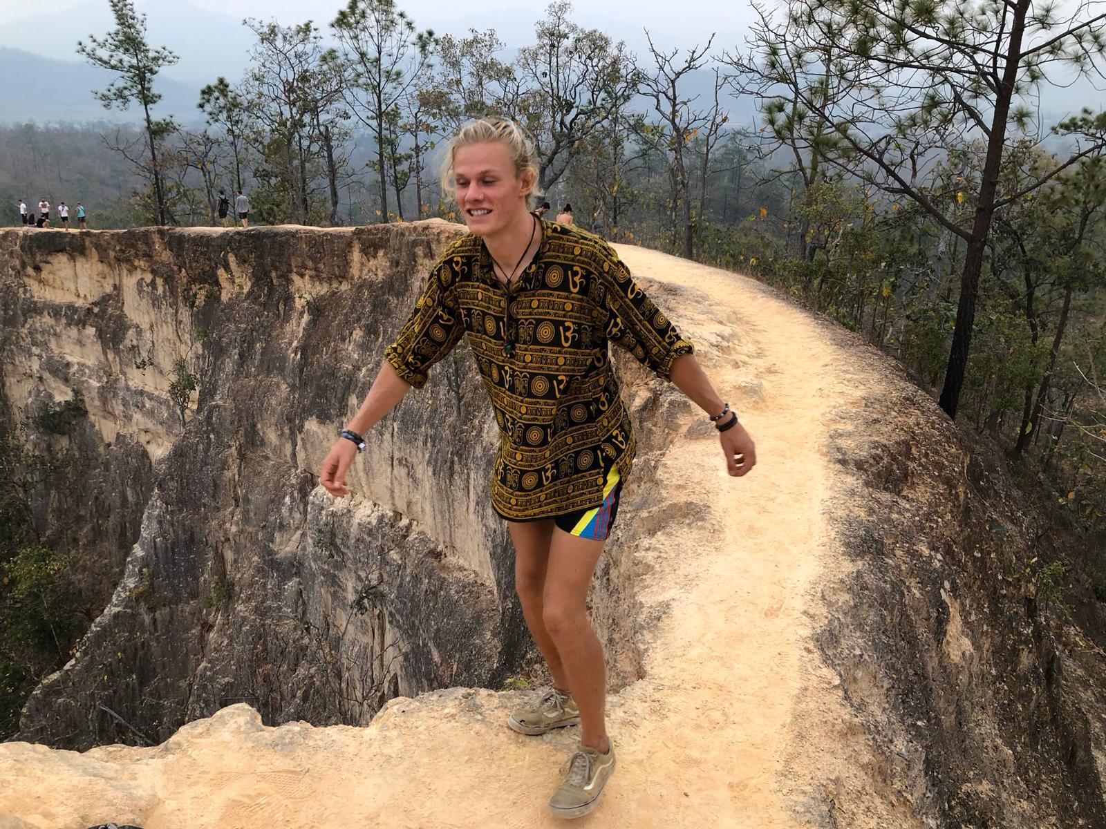 Jelle tijdens zijn tripje. Op de foto is ook de beruchte zwembroek te zien.