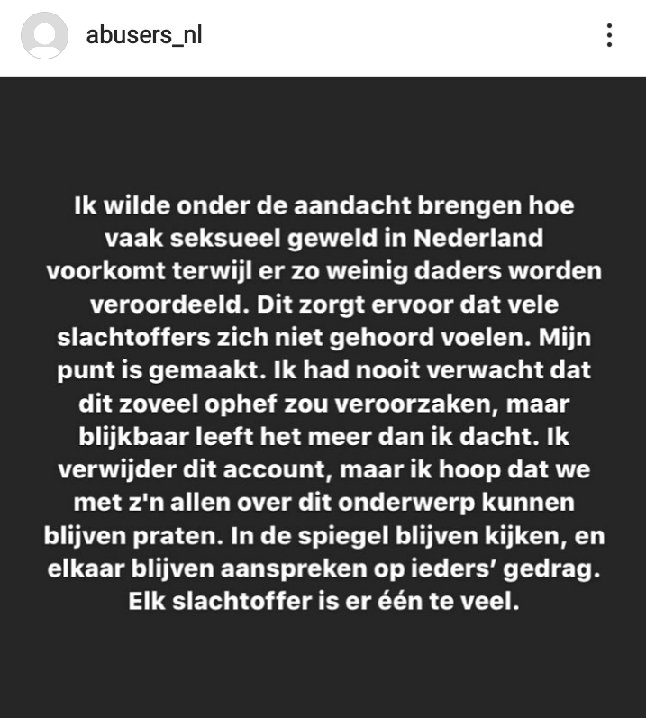 De beheerder van abusers_nl heeft inmiddels besloten om het account te verwijderen. Ze schrijft dat het meer ophef veroorzaakte dan ze had verwacht. "Ik verwijder dit account, maar ik hoop dat we met z'n allen over dit onderwerp kunnen blijven praten. In de spiegel blijven kijken en elkaar blijven aanspreken op ieders' gedrag. Elk slachtoffer is er één te veel."