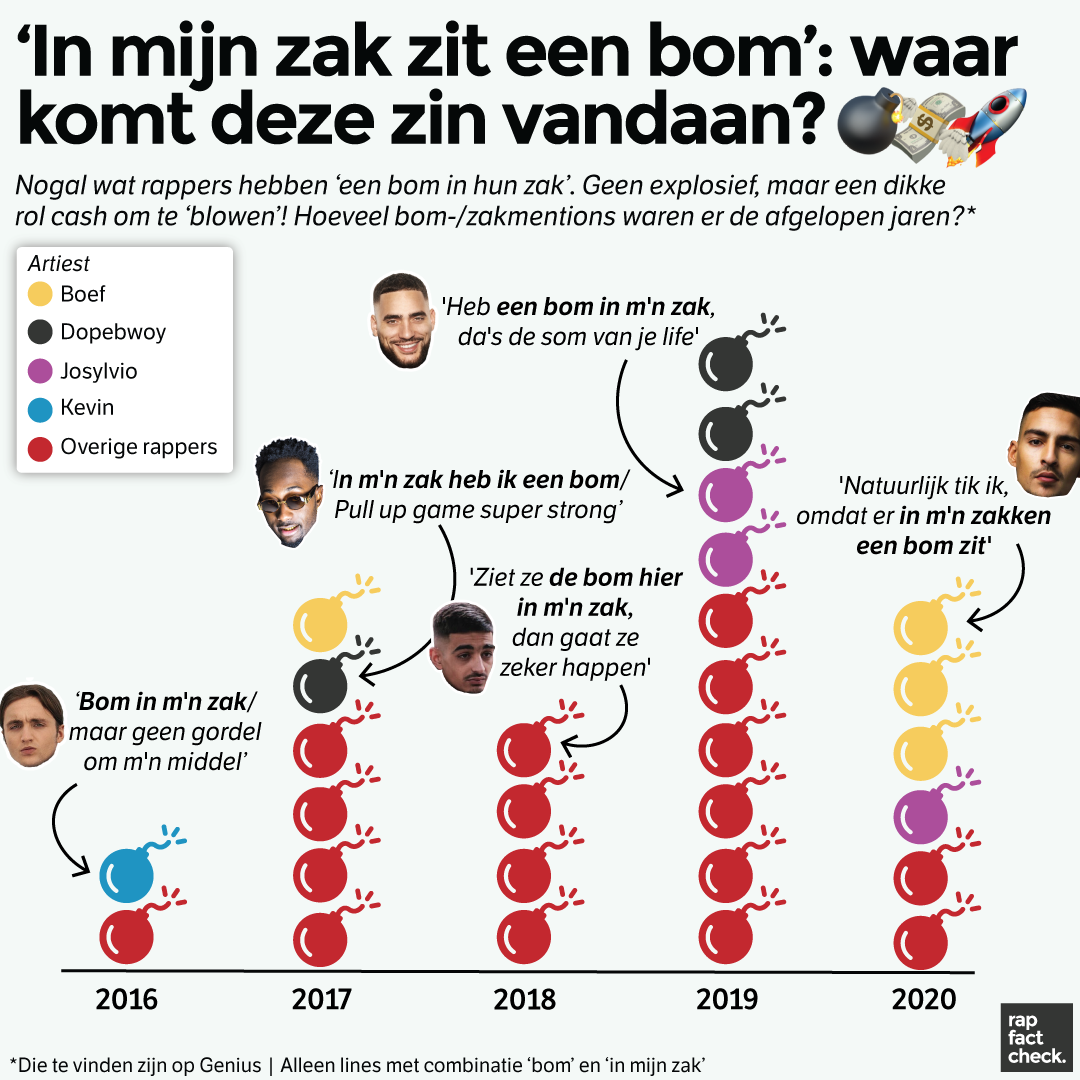 Oké, dat is een geruststelling, maar er is natuurlijk nog één belangrijke vraag. Want waar komt deze line opeens vandaan? Yordi ging ver terug in de tijd om uit te zoeken wie de eerste artiest was die een 'bom in zak'-mention deed in zijn lyrics. Met resultaat! "Het gaat in ieder geval terug tot 2016, waarin Kevin op het nummer We Don't Stop, voor zover ik weet, de eerste bom-mention deed."
