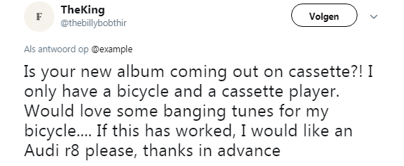 Andere fans zagen de actie van Example als een kans om een cadeautje te krijgen van de rapper. Zo probeerde eentje een Audi R8 (minimaal 230.000 euro) te fixen, omdat hij geen muziek kan luisteren op de fiets. Niet geschoten is altijd mis.