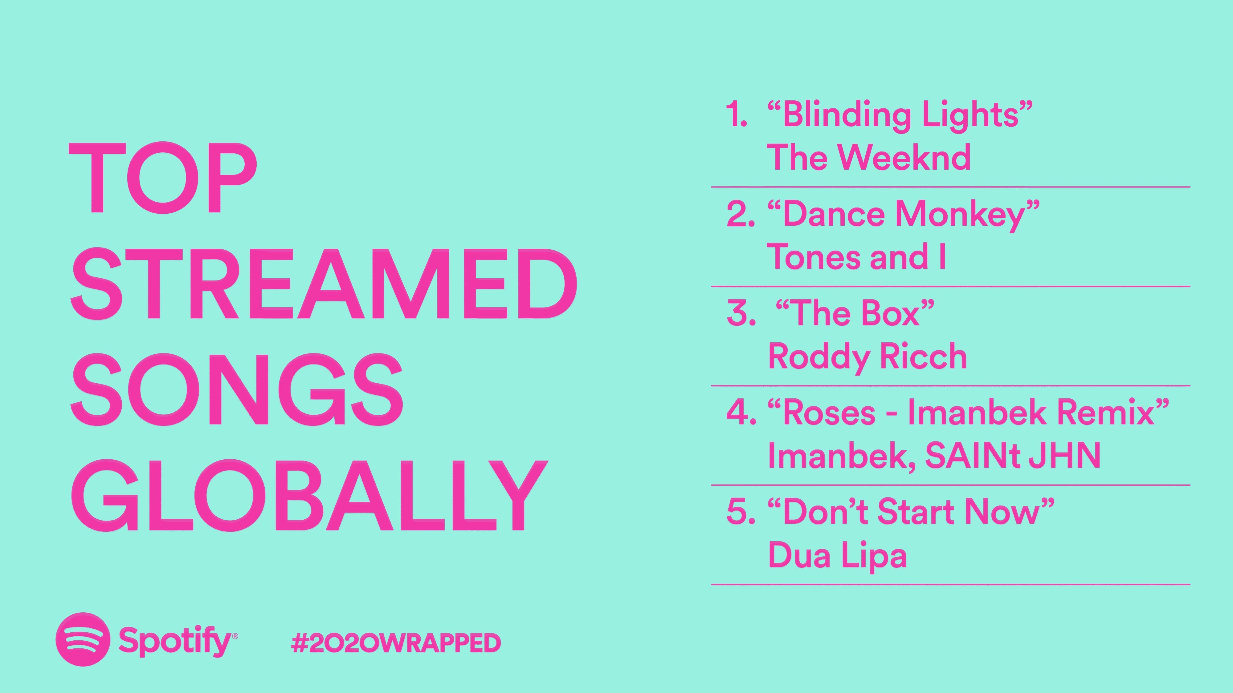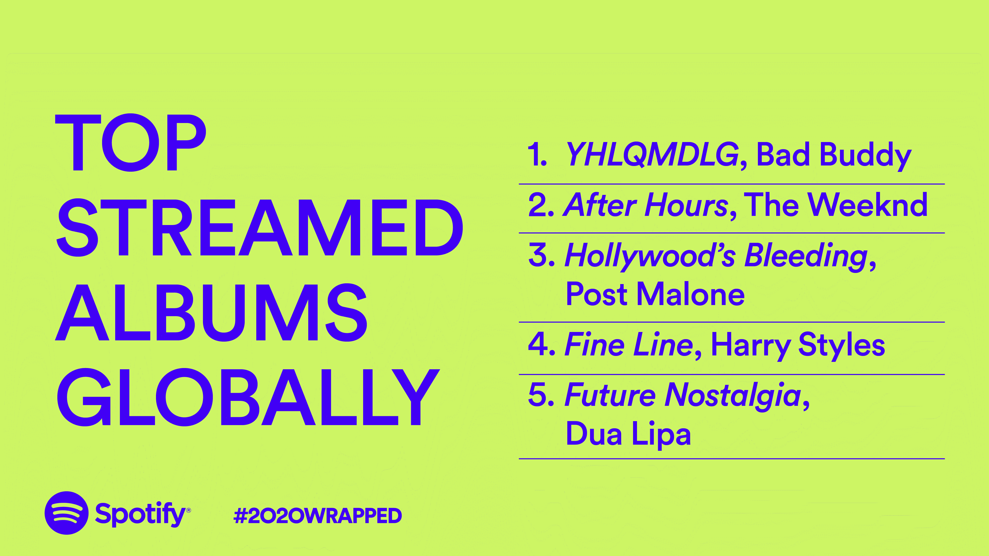 Zoals elk jaar heeft Spotify in Spotify's Wrapped weer op een rijtje gezet naar welke artiesten en tracks we afgelopen jaar het meeste luisterden. Welke tunes sleepten onze door de quarantaine heen? En welke artiesten hadden de meest virale hits van 2020?