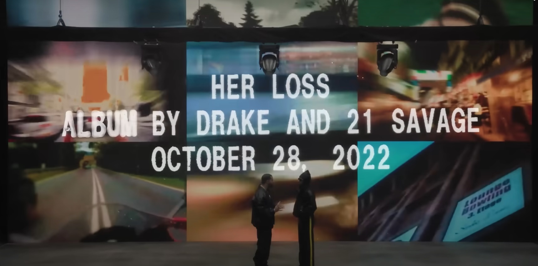 Het tweetal dropte gisteren de videoclip van hun gezamenlijke track Jimmy Cooks, hun samenwerking op Drake's Honestly, Nevermind. In de video, die geregisseerd is door topregisseur Mahfuz, verrasten de rappers hun fans met de bekendmaking van hun nieuwe project: "Her Loss. Album door Drake en 21 Savage. 28 oktober, 2022."