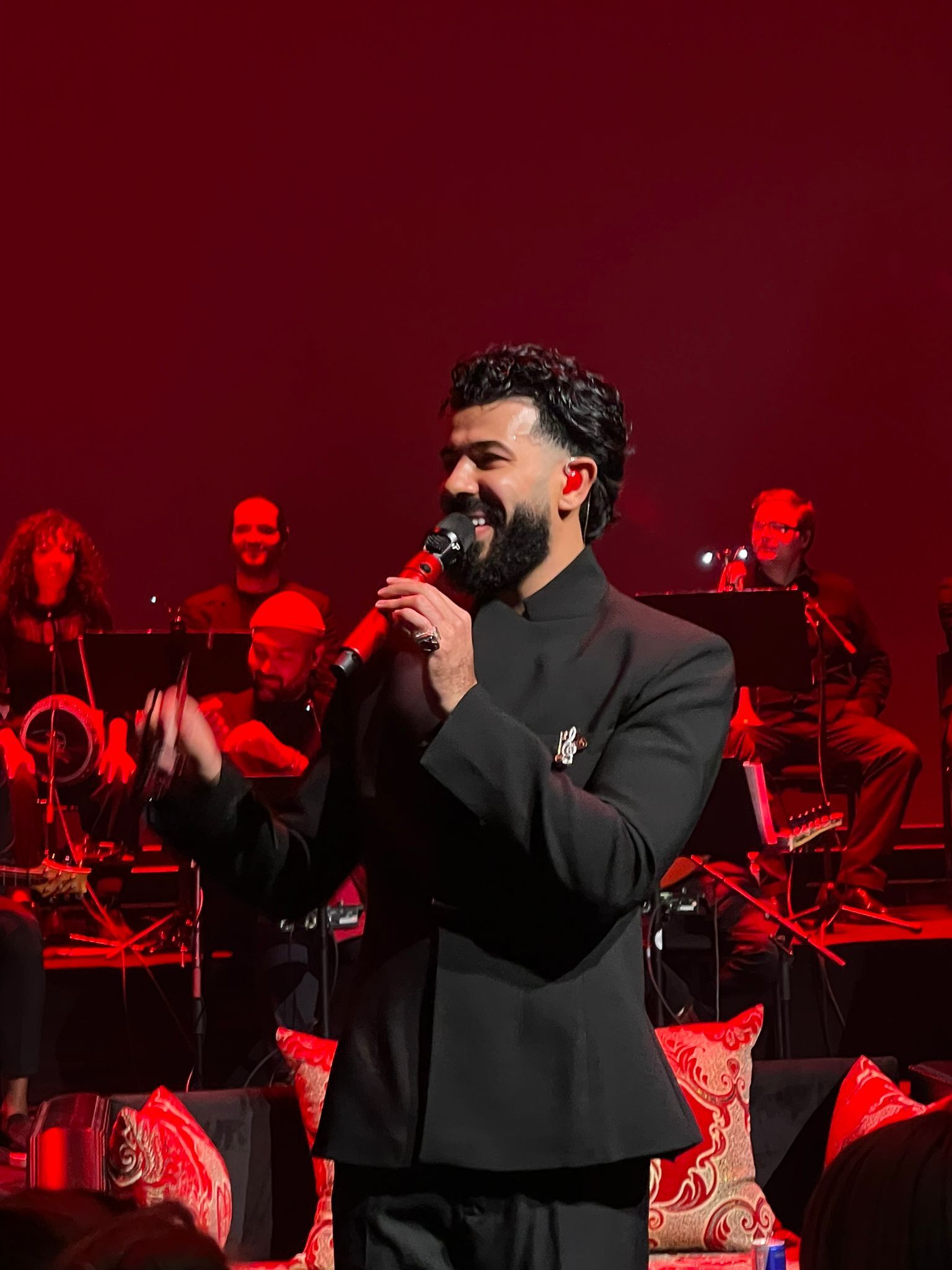 Dat dit concert anders is dan al zijn andere, maakt hij meteen duidelijk aan het publiek. “Normaal gesproken kom ik rennend het podium op, vandaag is het anders”, zegt DYSTINCT. “Jullie oom komt in pak.” De setting in het theater is groots en chic. Op het podium staat een volledig orkest, strak opgesteld. Achter het orkest hangt een ongelofelijk groot scherm met visuals, en voor het orkest staat een Marokkaans bankstel, wat zorgt voor een warme en persoonlijke touch. Het geeft de show iets huiselijks en onderstreept de verbinding met zijn roots. De huiselijke sfeer is ook terug te zien in de bezoekers. Er zijn mensen van in de twintig en dertig, maar ook opvallend veel gezinnen met kinderen, ouders en grootouders.