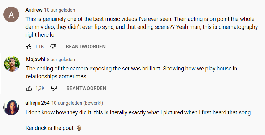 De film laat zien hoe onstuimig een langdurige relatie kan zijn: Kendrick en Taylour hebben een heftige discussie, schelden elkaar uit, kleineren elkaar, maar belanden uiteindelijk toch weer op de bank voor een potje zogeheten goedmaakseks. "Dit is precies wat ik voor me zag toen ik het nummer voor het eerst hoorde", klinkt het massaal in de comments op YouTube.