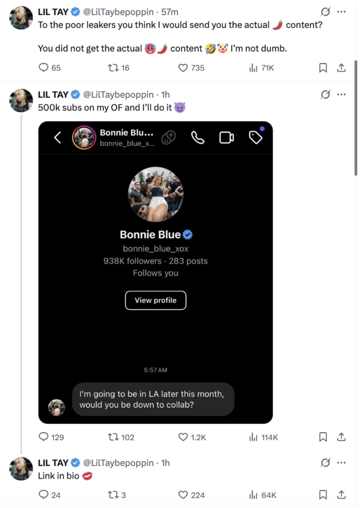Daarnaast hintte Tay op een mogelijke samenwerking met Bonnie Blue, die eerder dit jaar viraal ging met de bewering dat ze in twaalf uur met meer dan duizend mannen seks had gehad. In een gedeeld screenshot zou Blue haar gevraagd hebben om samen content op te nemen. Tay reageerde met: "500k subs op mijn OF en ik doe het ." Tay gaf eerder aan dat ze direct na haar 18e verjaardag begon met het opnemen van content. Dit zou ze doen voor fans die al sinds 2023 vooruitbestellingen hebben geplaatst, toen ze nog minderjarig was.