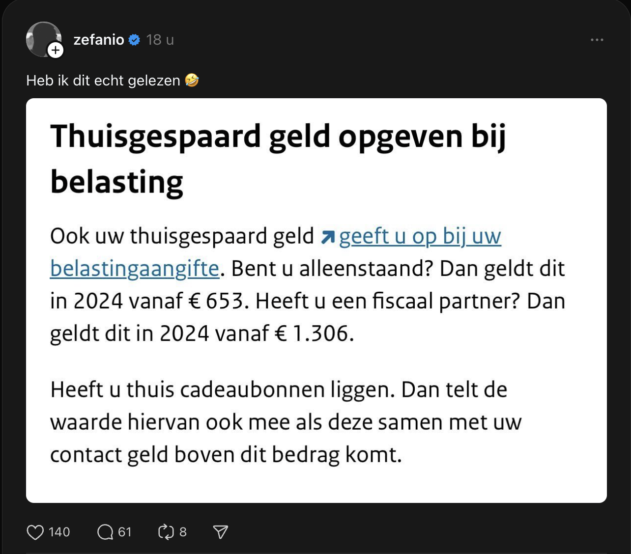 Zefanio maakte onlangs bekend op Threads dat hij een nogal opmerkelijke vondst had gedaan. Hij deelde een screenshot van de website van de Belastingdienst. Daarin maakte het instituut duidelijk dat men ook hun thuisgespaard geld jaarlijks moet opgeven. Voor sommigen is dat een logische gedachte, mits het bedrag natuurlijk hoog genoeg is. Toch was het minimale spaarbedrag wat bij de Belastingdienst opgegeven moet worden maar 653 euro als alleenstaande. Voor koppels is dat het dubbele: 1306 euro. Ook moeten cadeaubonnen opgegeven worden bij de Belastingdienst.